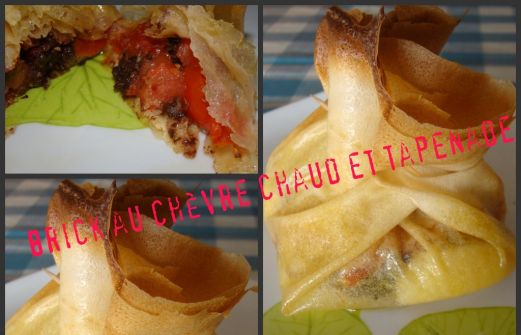 Recette du livre : "Bricks et papillotes" Pour 4 personnes : - 30g de beurre ; - 8 feuilles de brick ; - 3 tomates ; - 8 tomates confites ; - 2 CS de basilic ciselé ; - 1 filet d'huile d'olive ; - 1 1/2 bûche de chèvre ; - 4 CS de tapenade d'olive noire. Faire fondre le beurr [...]