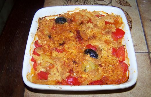pour deux personnes 2 courgettes, 1 poivrons rouges, deux tomates coupées en cubes , 20 grs de beurre, 3 c à soupe de farine, 3 c à soupe de chapelure, une poignée d'amandes effilées, 2 c à soupe de parmesan et une de gruyère rapé. un morceau de chorizo et quelques olives noires Coupez [...]
