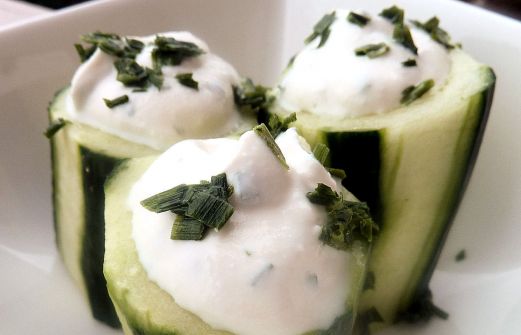 Après les courgettes, l’autre matraque verte de saison c’est le concombre, invariablement marié en salade avec la tomate. Pour changer un peu et le goût et la présentation, une recette qui rappelle un peu le tzatzÃki grec mais où le concombre est laissé entier pour plus de mâche et de croq [...]