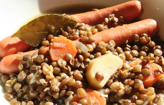 Voici la façon dont je prépare les lentilles depuis toujours. C'est simple, c'est bon et je pense qu'Herta devrait me sponsoriser :D. - 4 saucisses fumées - 1 pomme de terre - 1 carotte - 1 feuille de laurier - 1ct de thym séché - 1cc de graisse de canard - 1 bouil [...]
