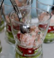 Encore une salade toute simple. Ici elle a fait l'unanimité. - 1 avocat - 2-3 tomates - des filets de saumon marinés à l'aneth - du riz cuits (200-300gr) - du basilic - vinaigre, huile, sel, poivre - un demi jus de citron Préparation: