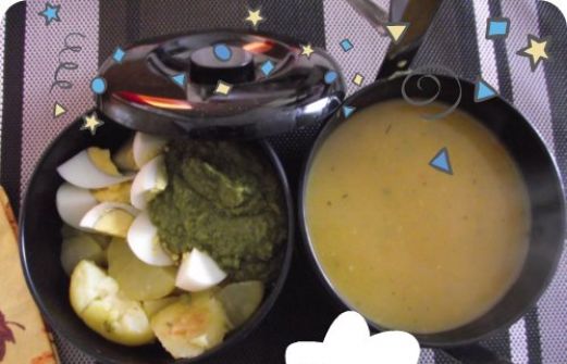 Youhouuuuu J'ai mon bento number 100!!!!!! Il n'est pas extra visuellement mais on s'en fiche ! bonne soupe de légumes pomme de terre ,oeuf dur et purée de brocolis ^^