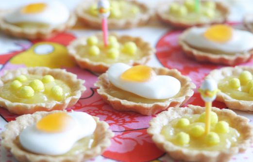 Petites tartelettes en pâte sablée (là , la recette) au citron (ici, la recette du lemon curd) et pour le reste, c'est de la décoration de bonbons...