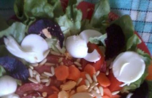 Salade œuf dur, tomate, betterave et carotte Nouvelle recette de salade!! Ingrédients : Quelques feuilles de salades vertes Un oeuf dur Quelques lamelles de betterave cuite Une carotte Une tomate Des pignons pin (pour la déco et le croquant) Matéri [...]